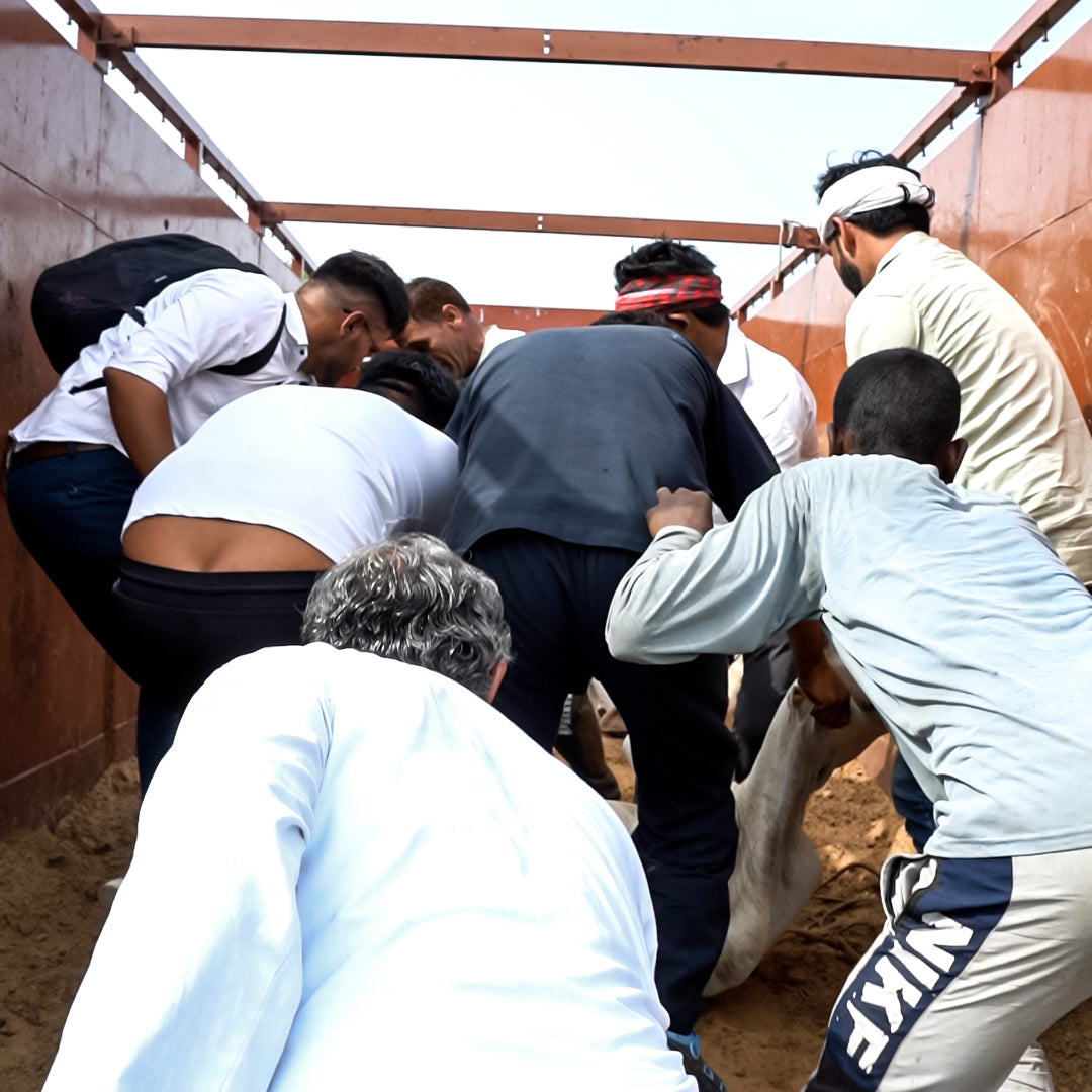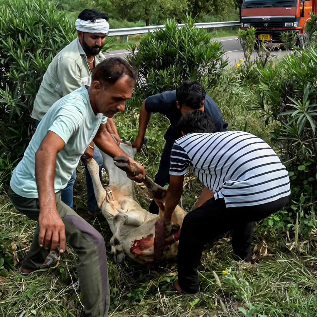 Last week, a gentle cow suffered a terrible accident when a speeding truck hit her on the roadside. She lay there helpless, bleeding, and in extreme pain. Passersby were scared, and no one came forward to help. Our Jain Samaj Seva team rushed to the scene, carefully lifted her, and prepared to take her to safety.